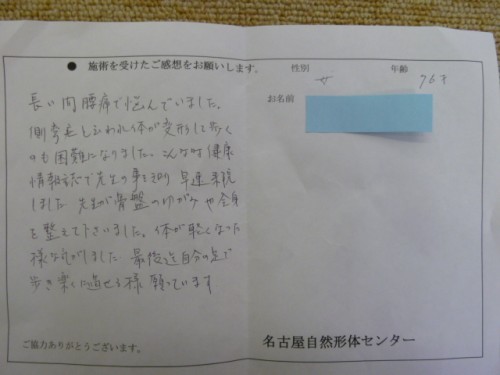 息子さんが、当院が掲載された本「カラダに効く名古屋」を買ってくれたことがきっかけで、こちらを知り通院するようになり「来てよかった」と喜んで頂いております。